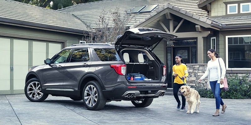 You can get the 2021 Ford Explorer in six trims, the Base, XLT, Limited, ST, King Ranch, and Platinum. The Base offers LED taillights, a body-color liftgate spoiler, and a power liftgate. Move up to the XLT for power and heated sideview mirrors. The Limited adds LED fog lamps, dual chrome exhaust tips, power-folding mirrors, and rain-sensing wipers. On the ST, you get LED taillamps with a unique blackout treatment, quad chrome exhaust tips, and a hands-free, foot-activated liftgate.