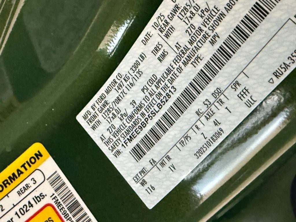 Equipment Group 332A Mid Package: 17" Carbonized Gray-Painted Aluminum Wheel; Rear Parking Sensors; Power Outlet - Back Side of Center Floor Console; Dual Smart Charging USB Ports; Front Row Heated Seats; Driver and Front Passenger Illuminated Sliding Visor Vanity Mirrors; AM/FM Stereo; Marine Grade Vinyl Heated Bucket Seats; Dual-Zone Electronic Automatic Temperature Control; Connected Navigation; LT285/70R17 A/T Tires; Ambient Footwell Lighting; Remote Start System; 2-Door Intelligent Access with Lock/unlock. Ford Co-Pilot360: Auto High-Beam Headlamps; Rear View Camera; Pre-Collision Assist with Automatic Emergency Braking; Blind Spot Information System (BLIS); Lane-Keeping System. Carbonized Gray Molded-In-color Hard Top. Ford Performance Heavy-Duty Modular Front Bumper. Door Storage Bags. Eruption Green Metallic. **Equipment listed is based on original vehicle build and subject to change. Please confirm the accuracy of the included equipment by calling the dealer prior to purchase.**