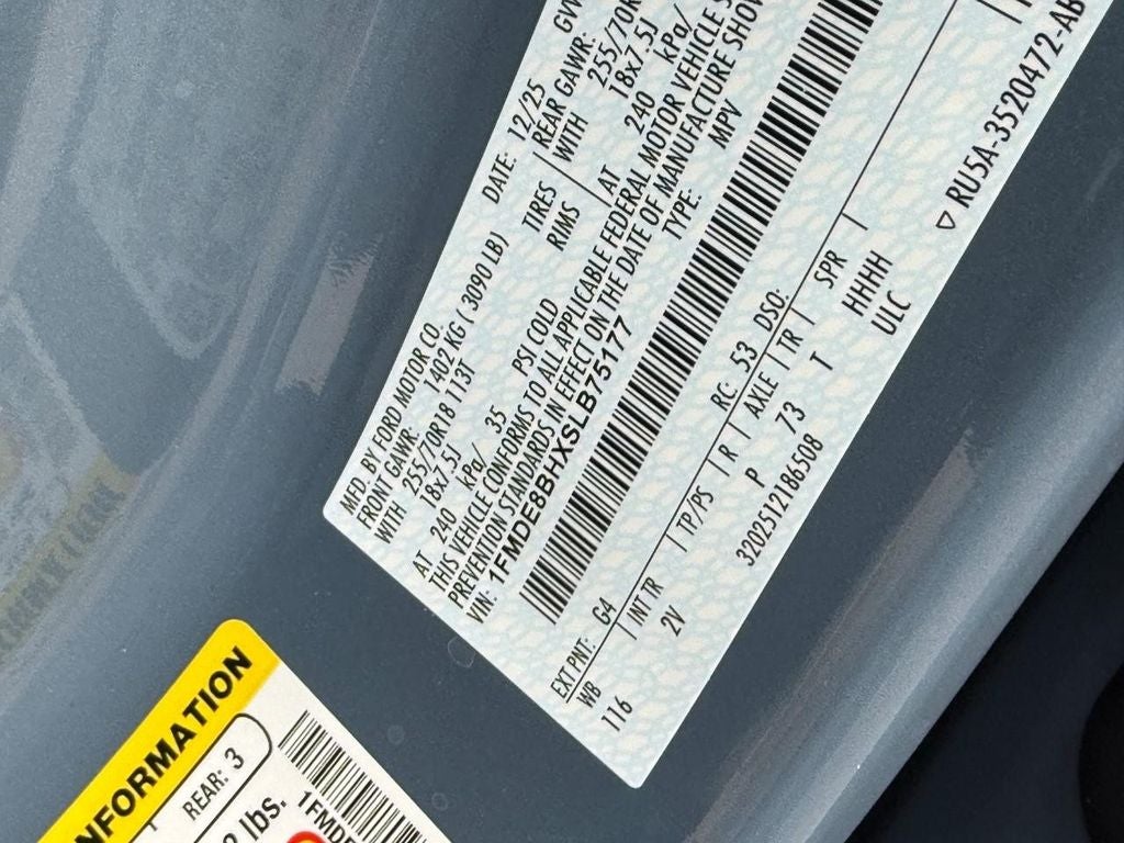 Equipment Group 314A Lux Package: 18" Bright Machined Aluminum Wheels; 3.73 Axle Ratio; 2.3L EcoBoost I-4 Engine; Evasive Steering Assist; 5. 920 lbs GVWR; Adaptive Cruise Control; Information on Demand Panel; B&O Sound System by Bang and Olufsen; Front Parking Sensors; 10-Speed Automatic Transmission; 360-Degree Camera; P255/70R18 A/T Tires; Universal Garage Door Opener; Heated Leather-Trimmed/vinyl Bucket Seats; Sideview Mirrors. Painted Hard Top. Azure Gray Met Tri-Coat. Hard Top Sound Deadening Headliner. Front and Rear Floor Liners Without Carpet Floor Mats. First Aid Kit. **Equipment listed is based on original vehicle build and subject to change. Please confirm the accuracy of the included equipment by calling the dealer prior to purchase.**