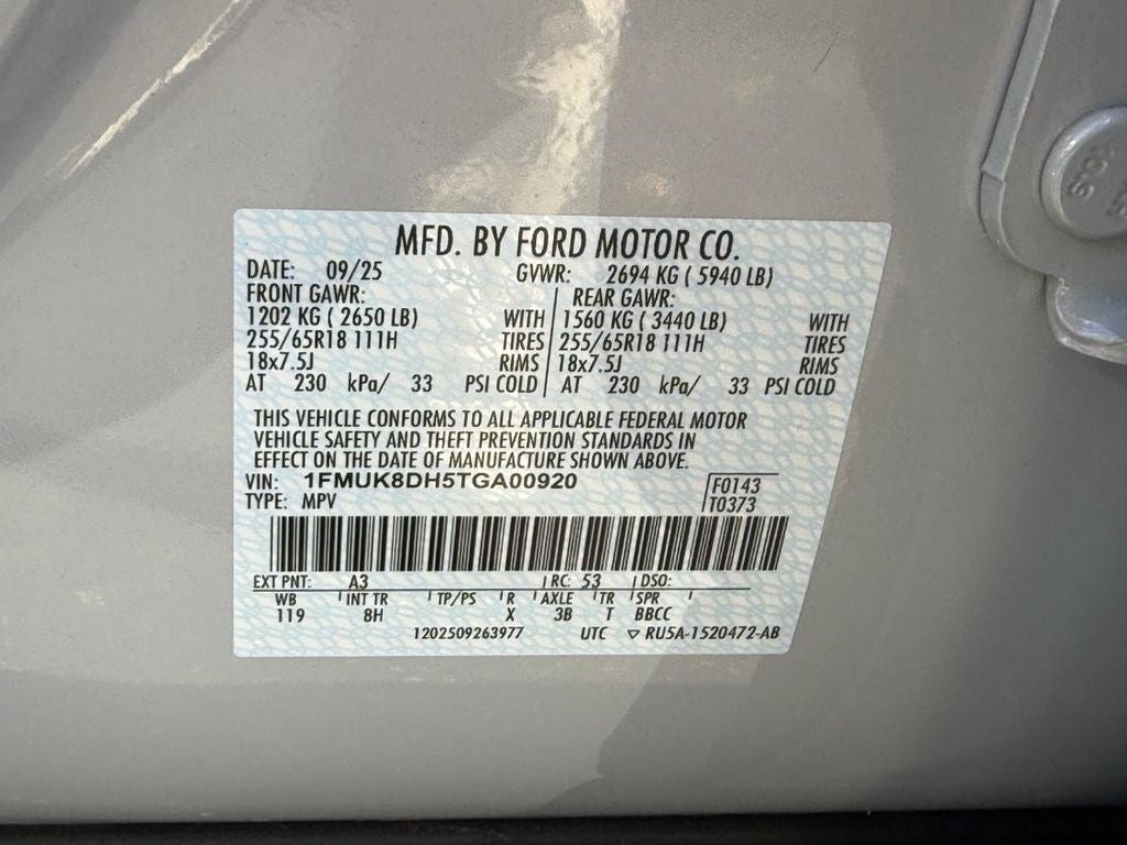 Equipment Group 200A Standard Package: 18" Sparkle Silver-Painted Aluminum Wheels; Active Badging; Black Roof-Rack Side Rails; Manual-Folding Sideview Mirrors; 8 USB Ports; 2.3L EcoBoost I-4 Engine; Power Liftgate; Vinyl-Wrapped Steering Wheel; Active Noise Cancellation; AM/FM Stereo; Black Lower Bodyside Cladding with Chrome Accent; 10-Speed Automatic Transmission; Unique Cloth Heated Captain's Chairs; P255/65R18 AS BSW Tires. **Equipment listed is based on original vehicle build and subject to change. Please confirm the accuracy of the included equipment by calling the dealer prior to purchase.**