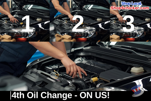*Offer valid after three consecutive, customer-paid oil changes performed at Schicker from start date 7/1/25. Oil changes must follow the manufacturer’s recommended mileage and time intervals. Complimentary or promotional oil changes do not count toward the required three. The fourth oil change will be provided at no charge after eligibility is confirmed.